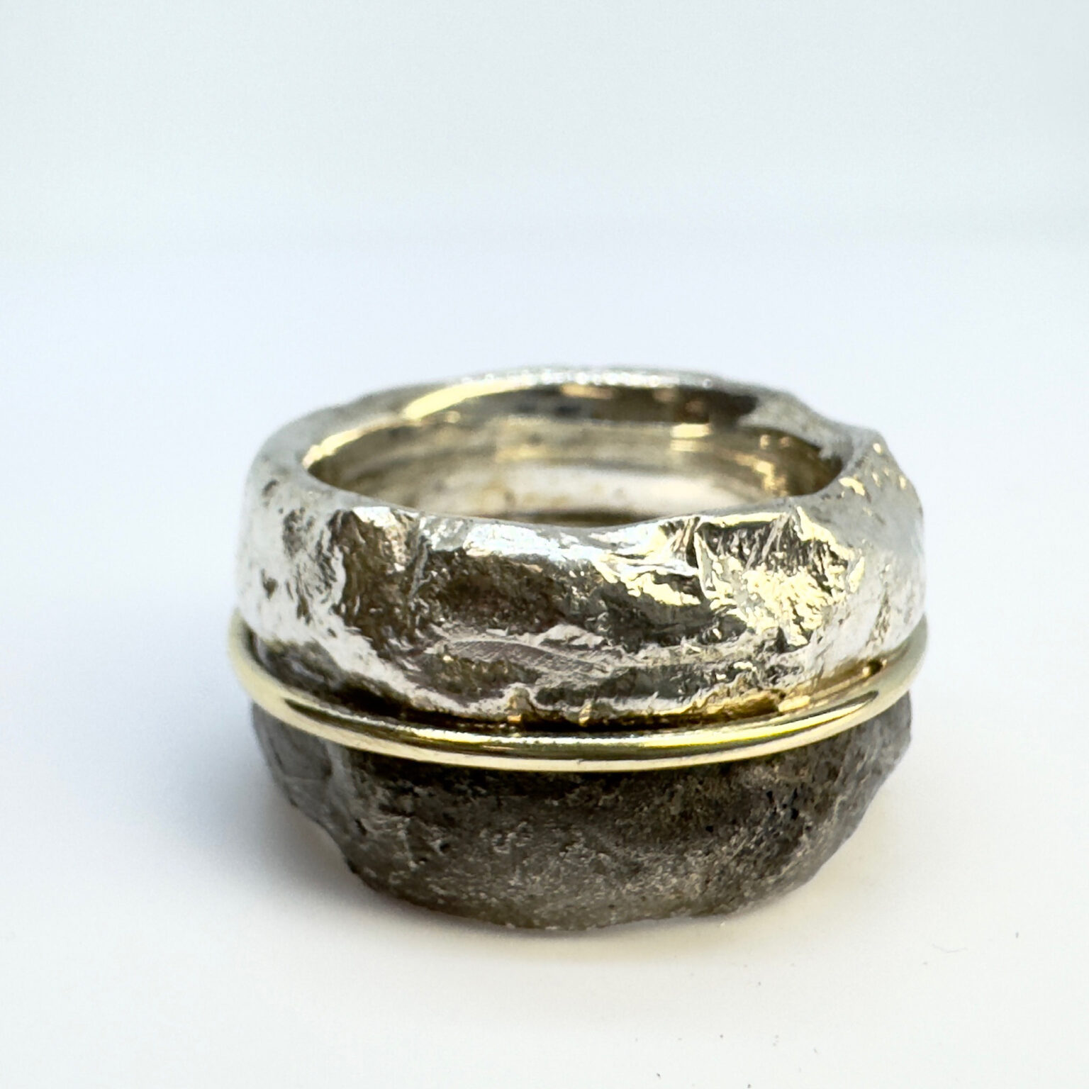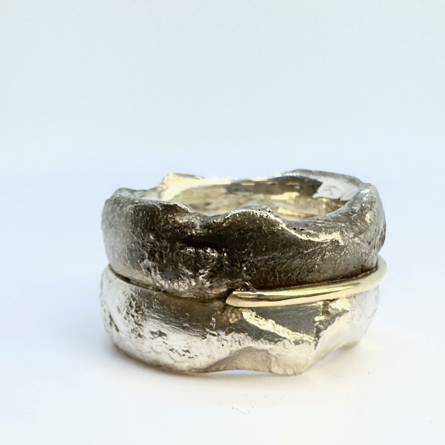 Bicolor Ring aus Silber/geschwärztem Silber mit geschmorter Oberfläche und Gelbgoldzwischendraht