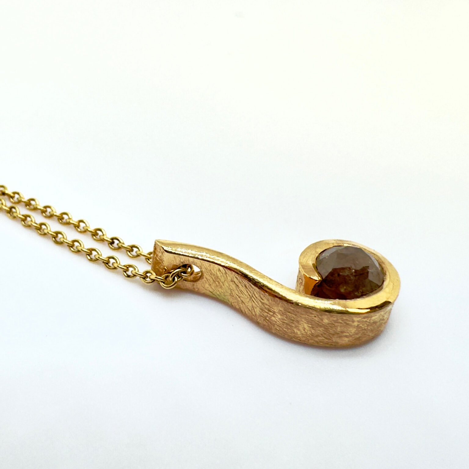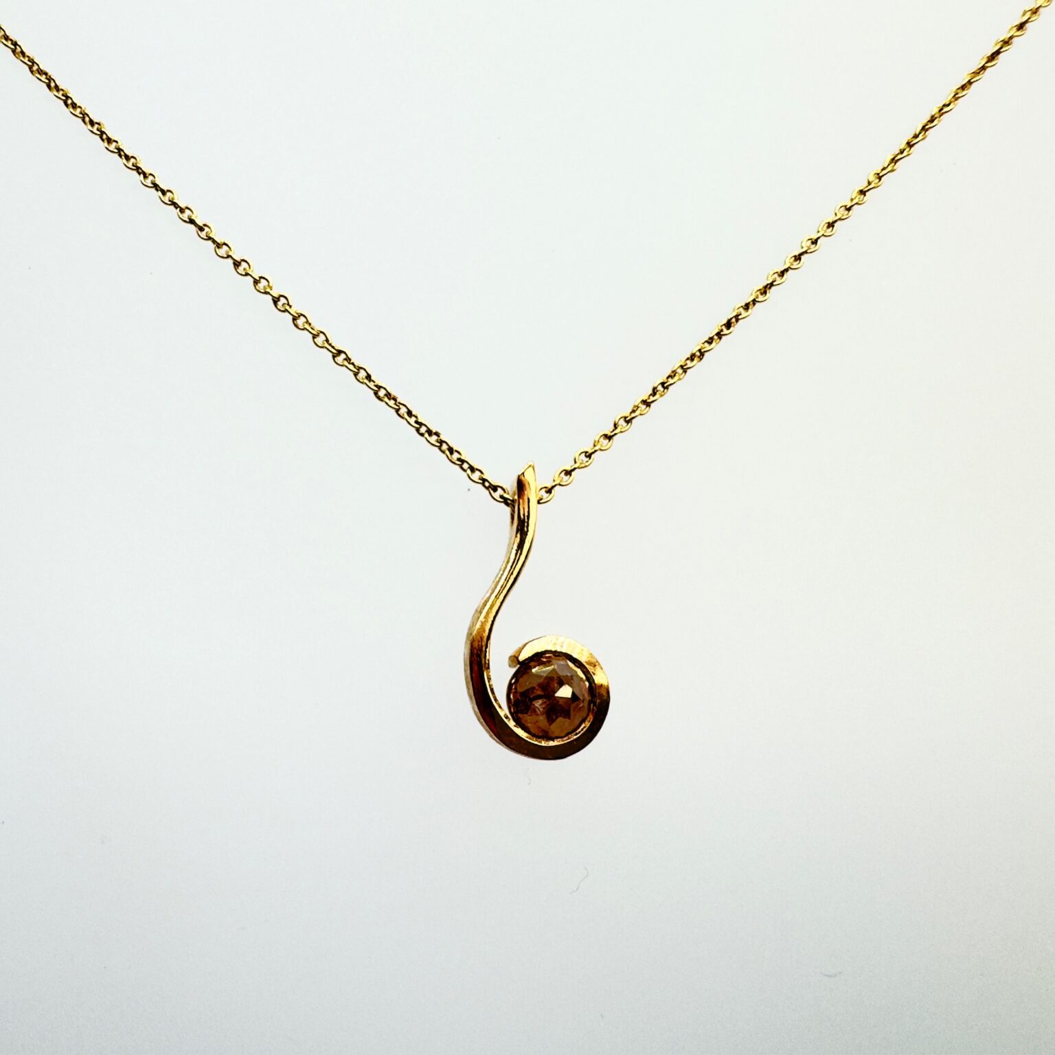 Diese elegante Kette vereint zwei Goldtöne mit einem faszinierenden Edelstein: Die 1 mm starke Rundankerkette aus 585er Gelbgold trägt einen fein gearbeiteten Anhänger aus 585er Roségold. Im Zentrum sitzt eine braune Diamantrose mit 0,3 ct – ihr flacher Schliff und die natürliche Farbnuance verleihen dem Schmuckstück einen antik-modernen Charakter. Der Anhänger misst 14,71 × 6,4 × 4,42 mm und setzt einen feinen, funkelnden Akzent.