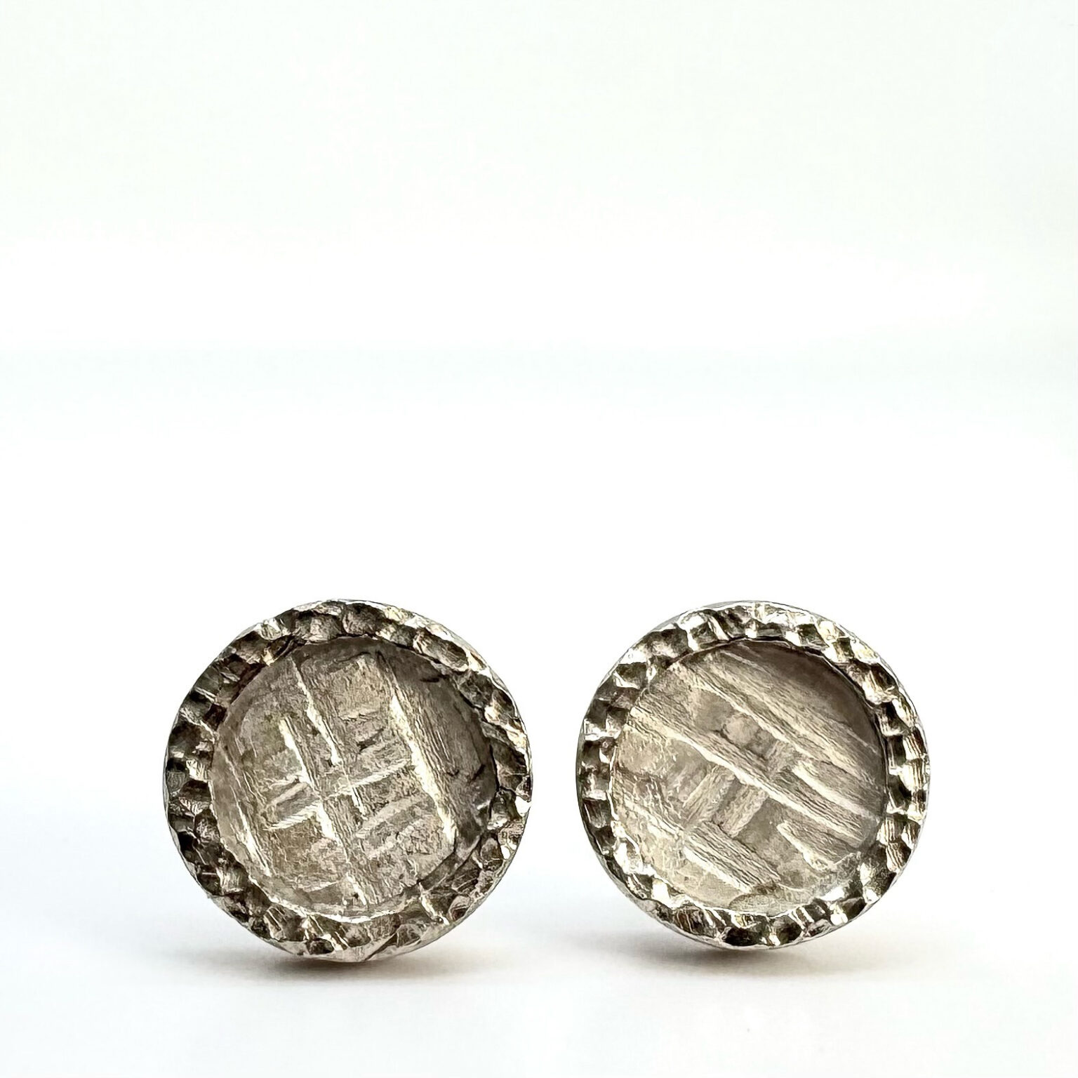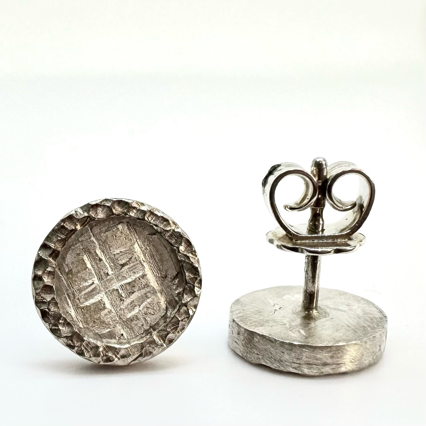 Diese hochwertigen Ohrstecker kombinieren eine lebendige Hammerschlag-Textur im Boden mit einer präzise gefrästen Rahmenoberfläche. Der Kontrast zwischen organischer Struktur und cleanen Fräsungen verleiht dem Design moderne Spannung und handwerkliche Raffinesse.