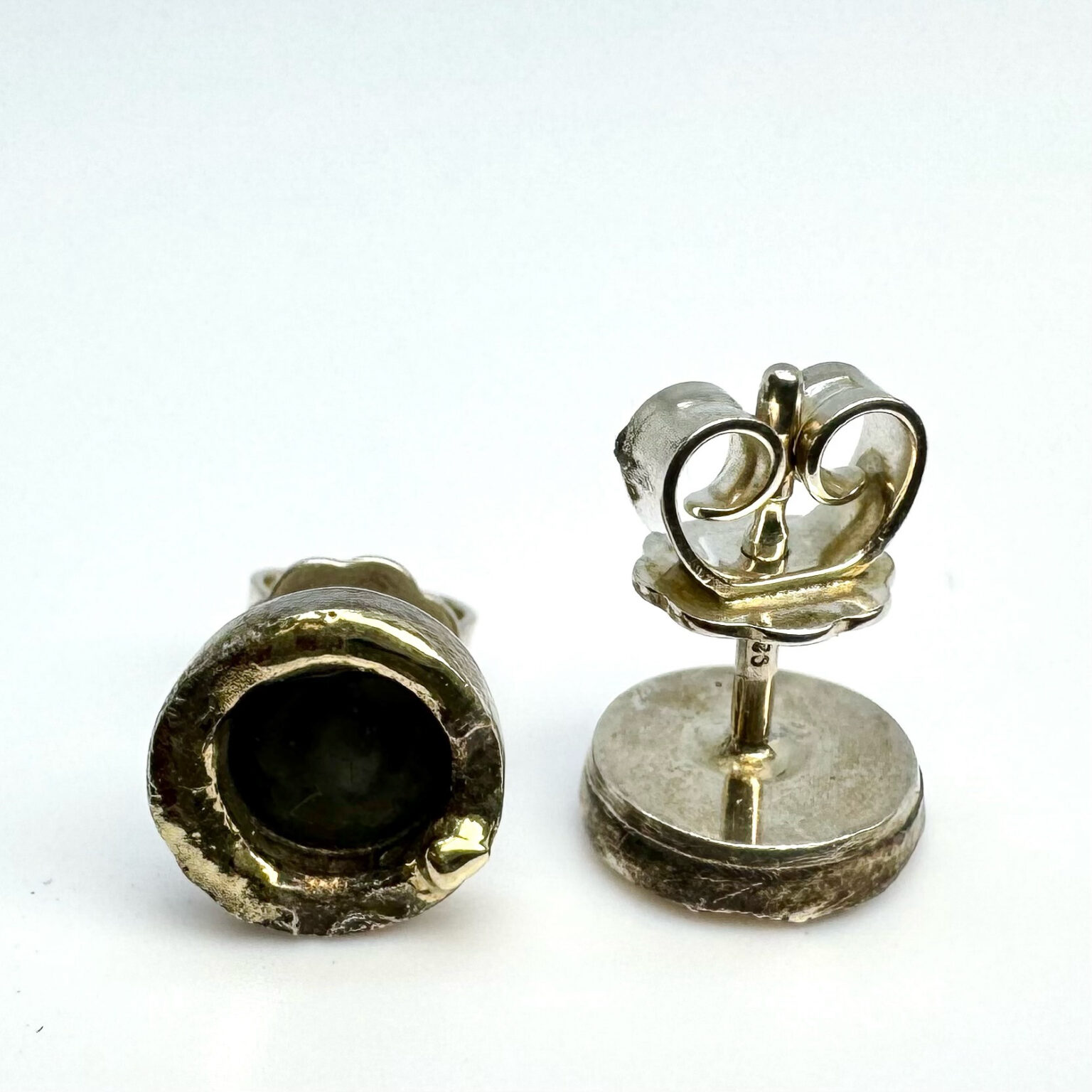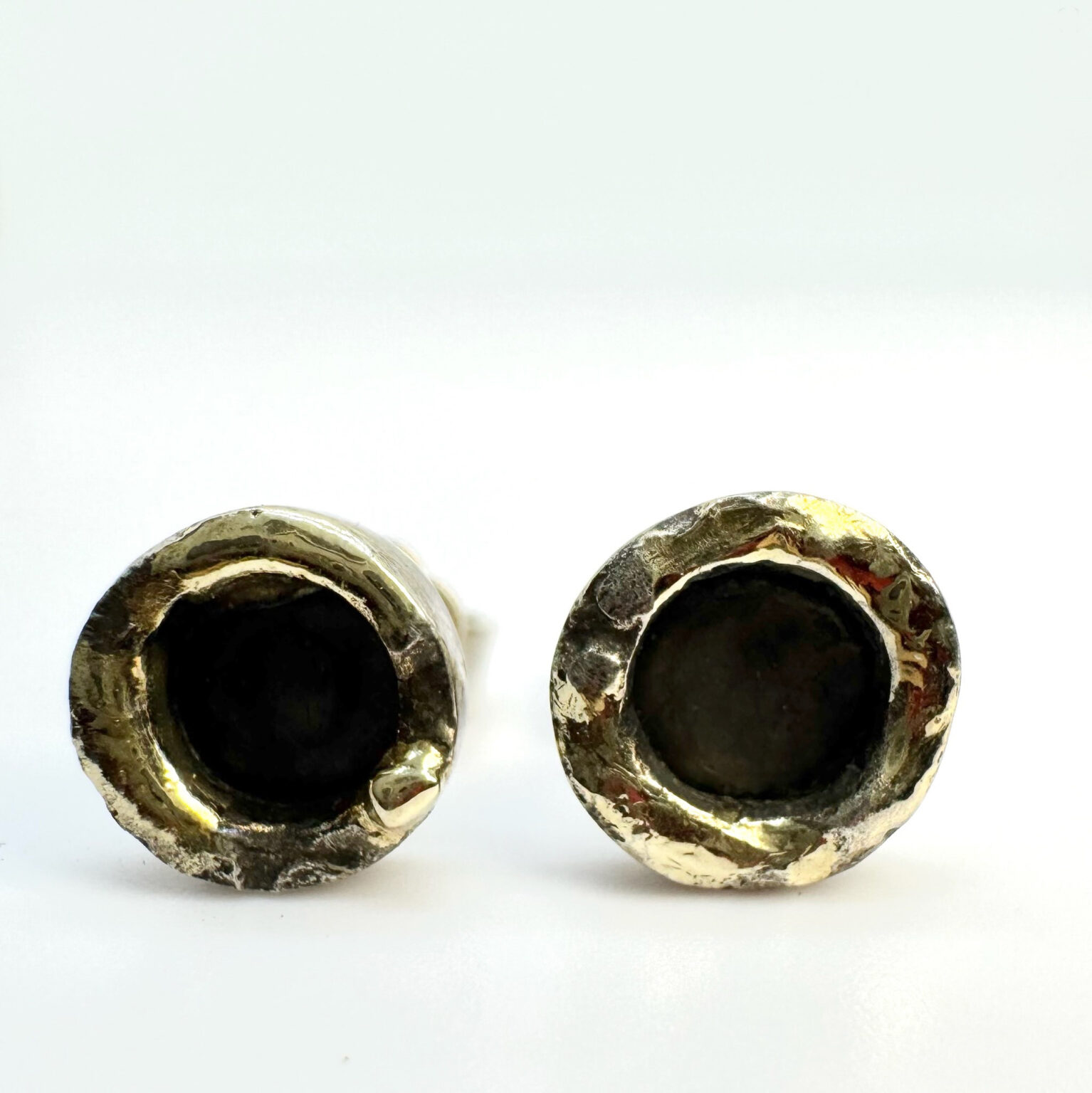 Diese eleganten Ohrstecker verbinden eine dunkle, geschmorte Oberfläche mit fein eingearbeiteten Akzenten aus 750/000 Gelbgoldlot. Das Zusammenspiel aus kontrastreichem Schwarz und warmem Gold verleiht dem Design Tiefe und Raffinesse.
