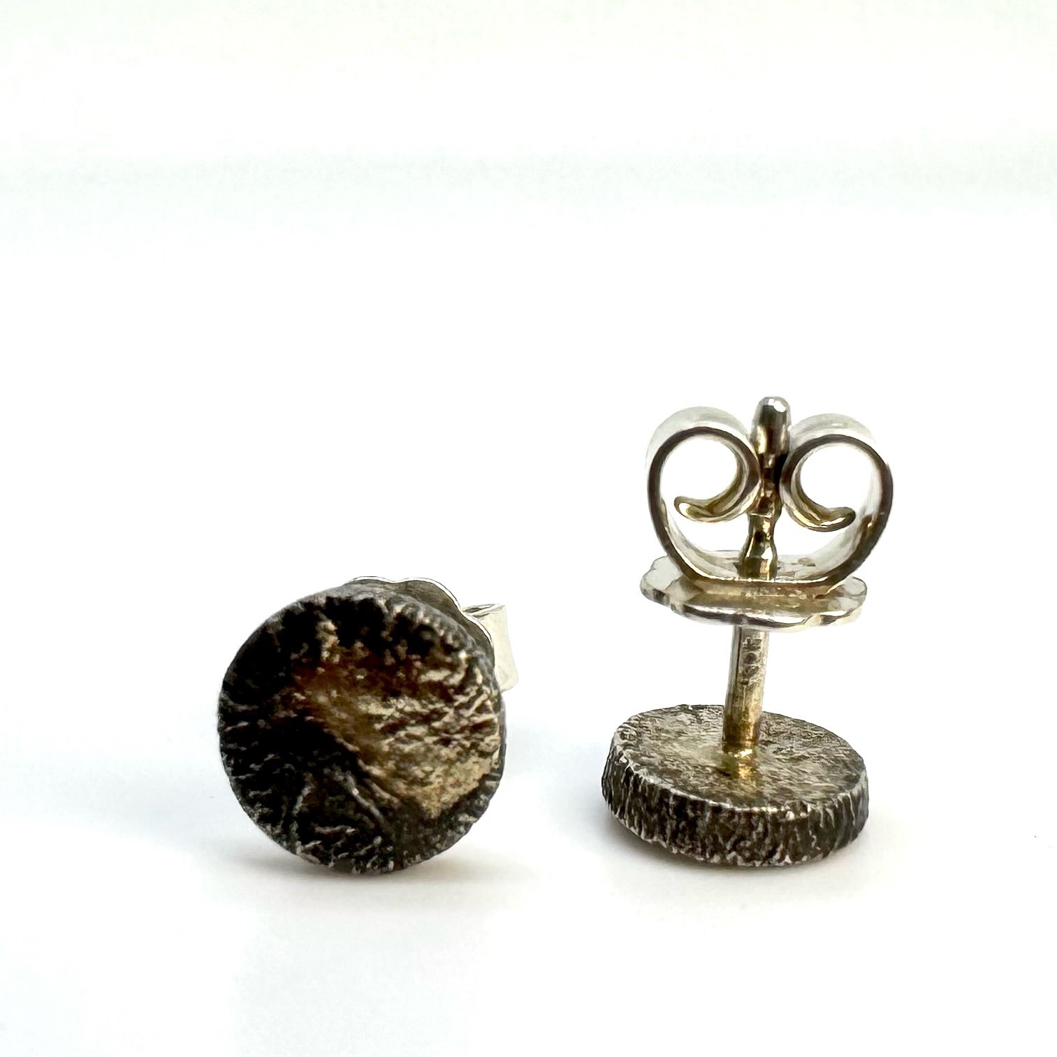 Ausdrucksstarke Ohrstecker mit geschmorter Oberfläche und feiner Goldlot-Verzierung – ein spannendes Spiel aus dunkler Patina und glänzenden Akzenten.