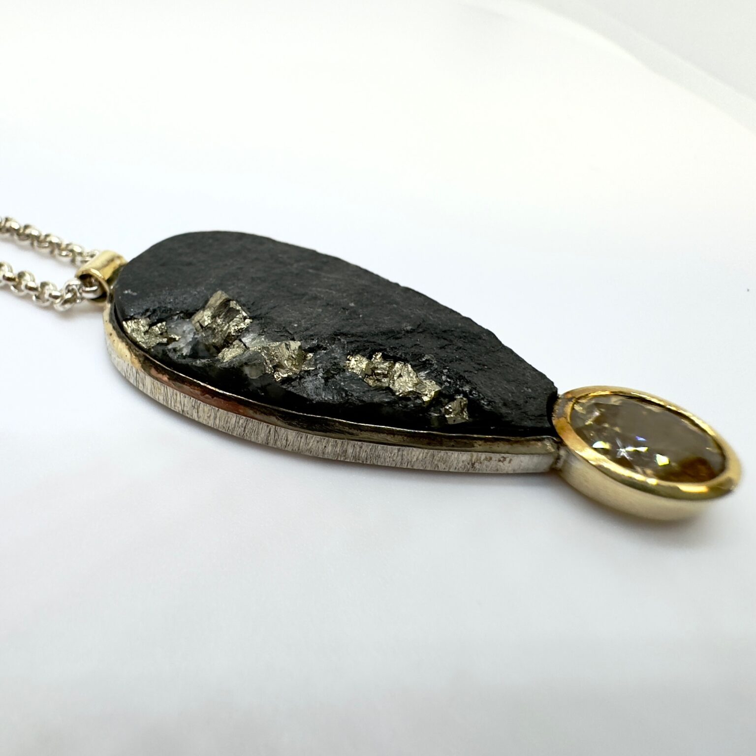 Unikat: Silber-Erbskette mit Bicolor-Anhänger, Schiefer-Pyrit Tropfen und facettiertem Citrin