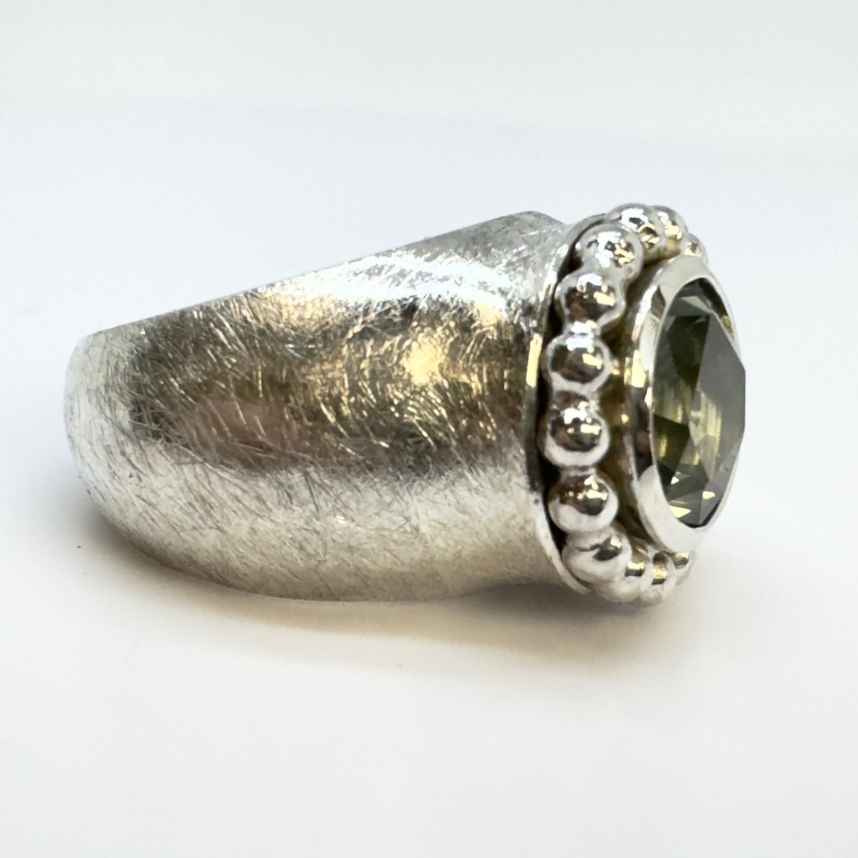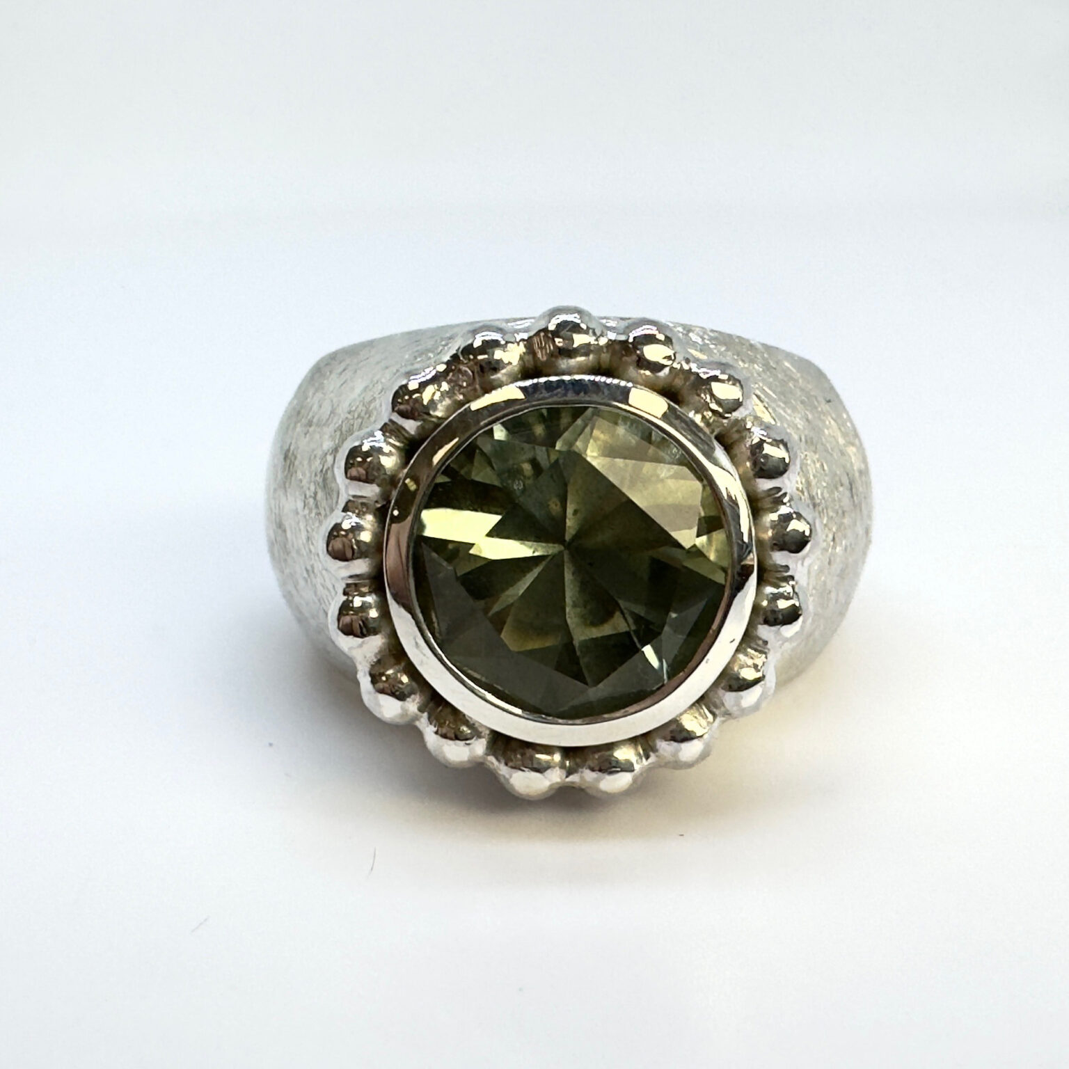 Silberring mit Kugeldraht und facettiertem Prasiolith in Silber gefasst