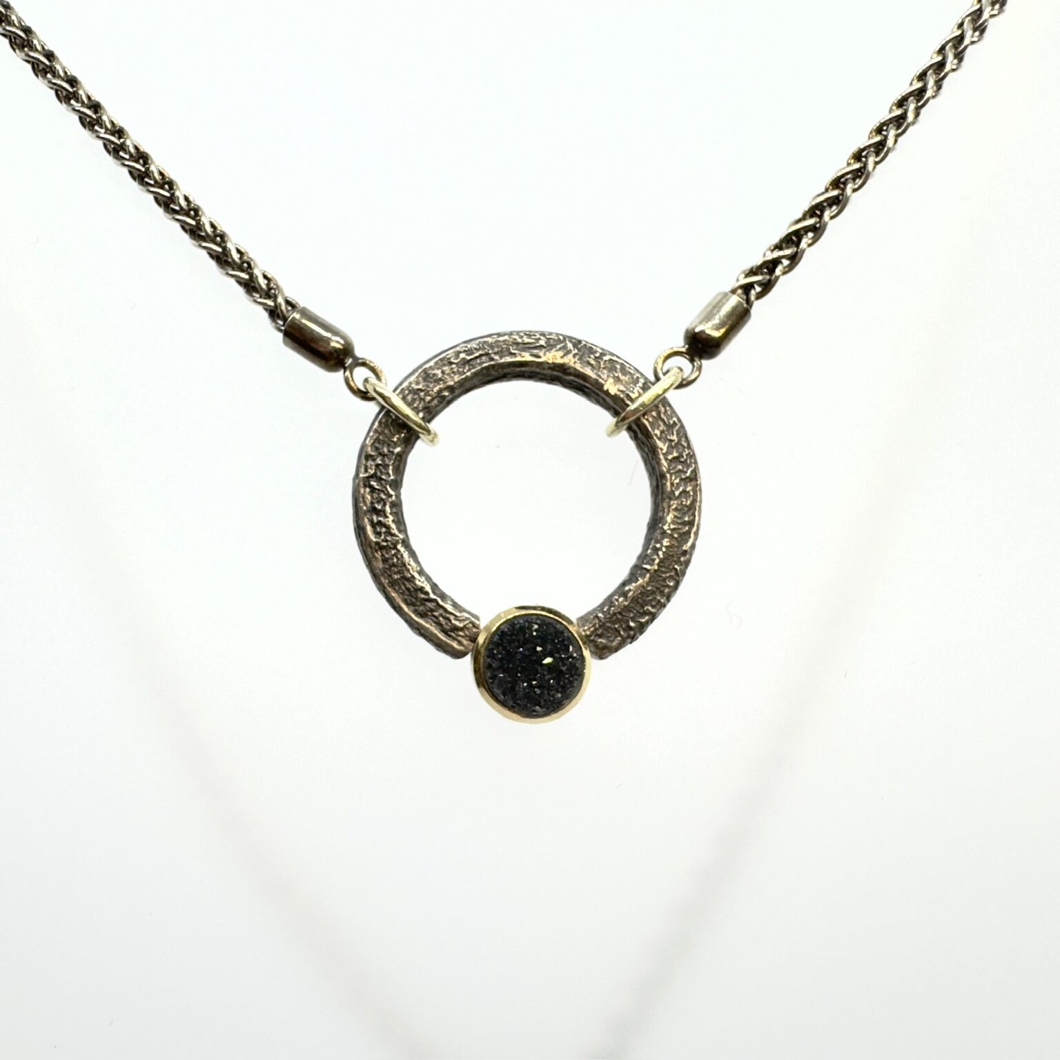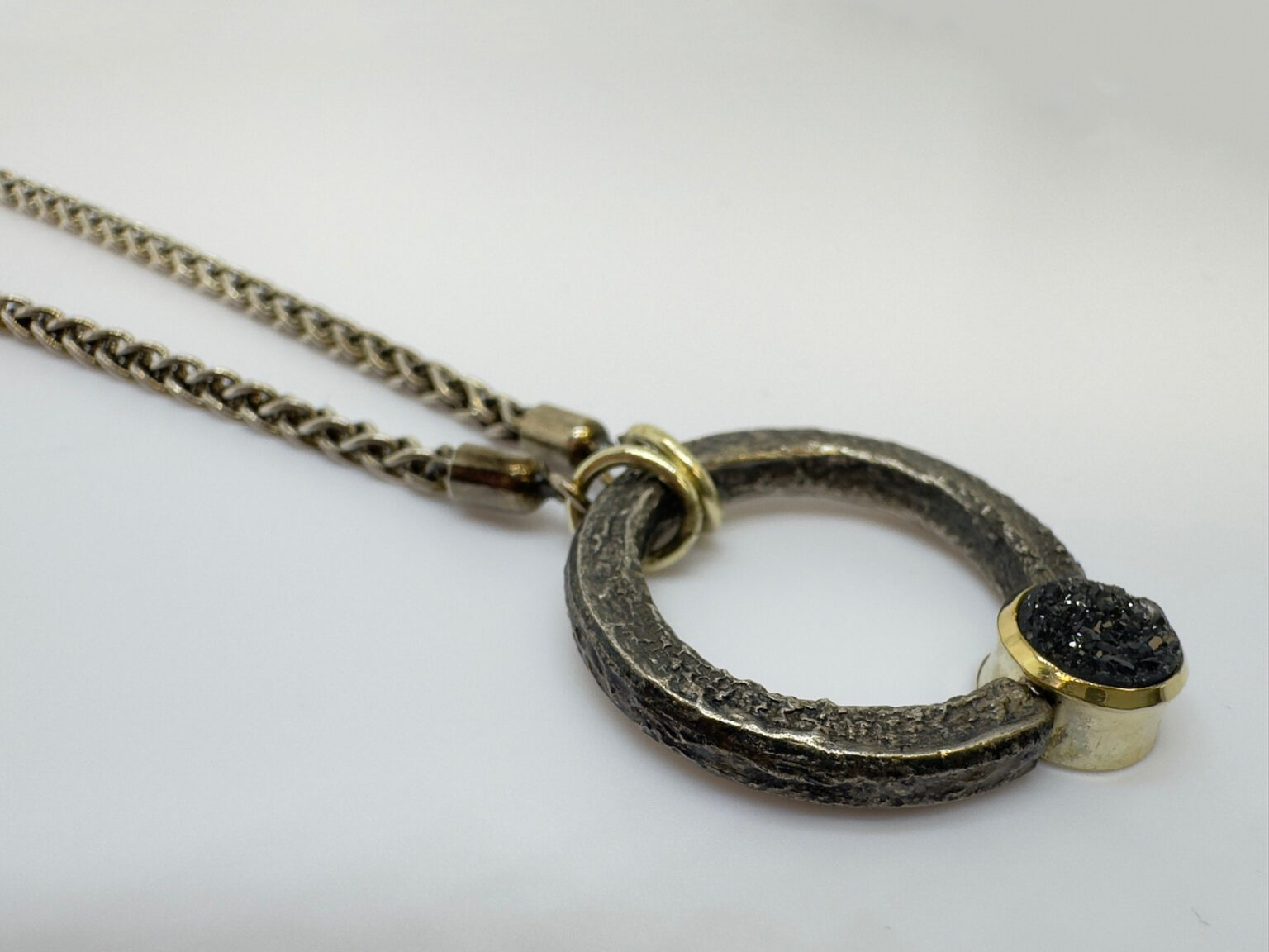 Unikat: Silberzopfkette mit geschwärzter Oberfläche, Bicolor-Zwischenteil, kristallisierter Onyx in Gelbgoldfassung